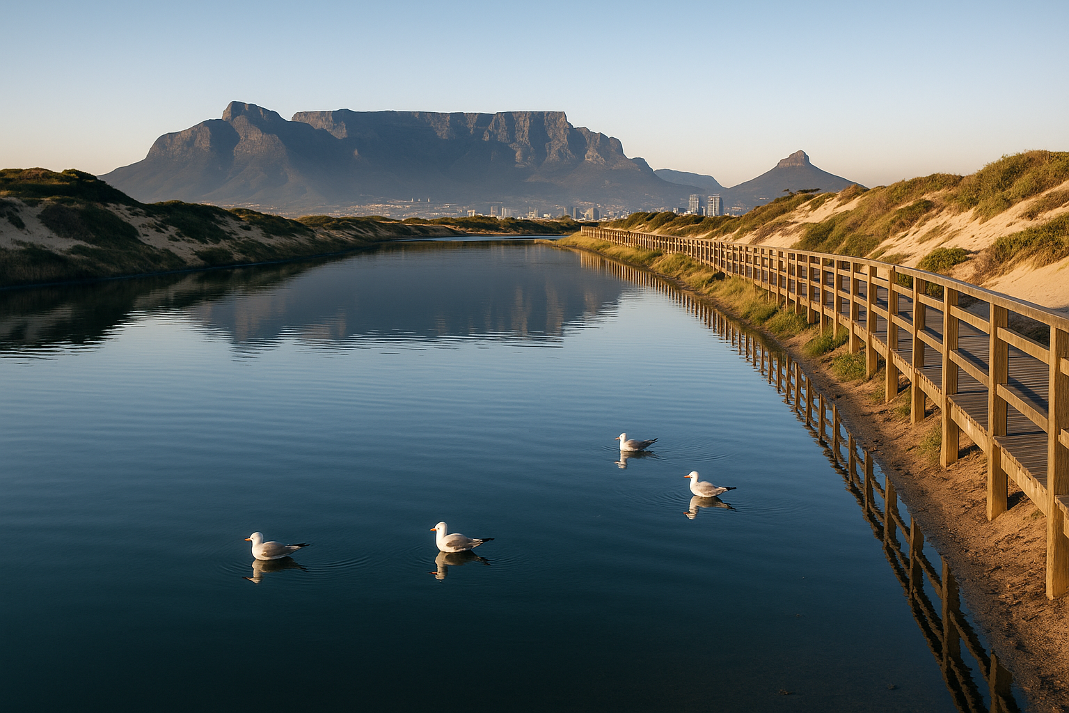 Stand on the small pedestrian footbridge that spans the Milnerton lagoon. When the sun crests at 07:47 it back-lights Table Mountain, turning the lagoon into a glassy mirror and giving photographers an uninterrupted skyline that’s impossible once commuter traffic arrives.Atmosphere: Salt-tinged air, distant gulls, and pastel bands of pink and gold that last barely fifteen minutes.
